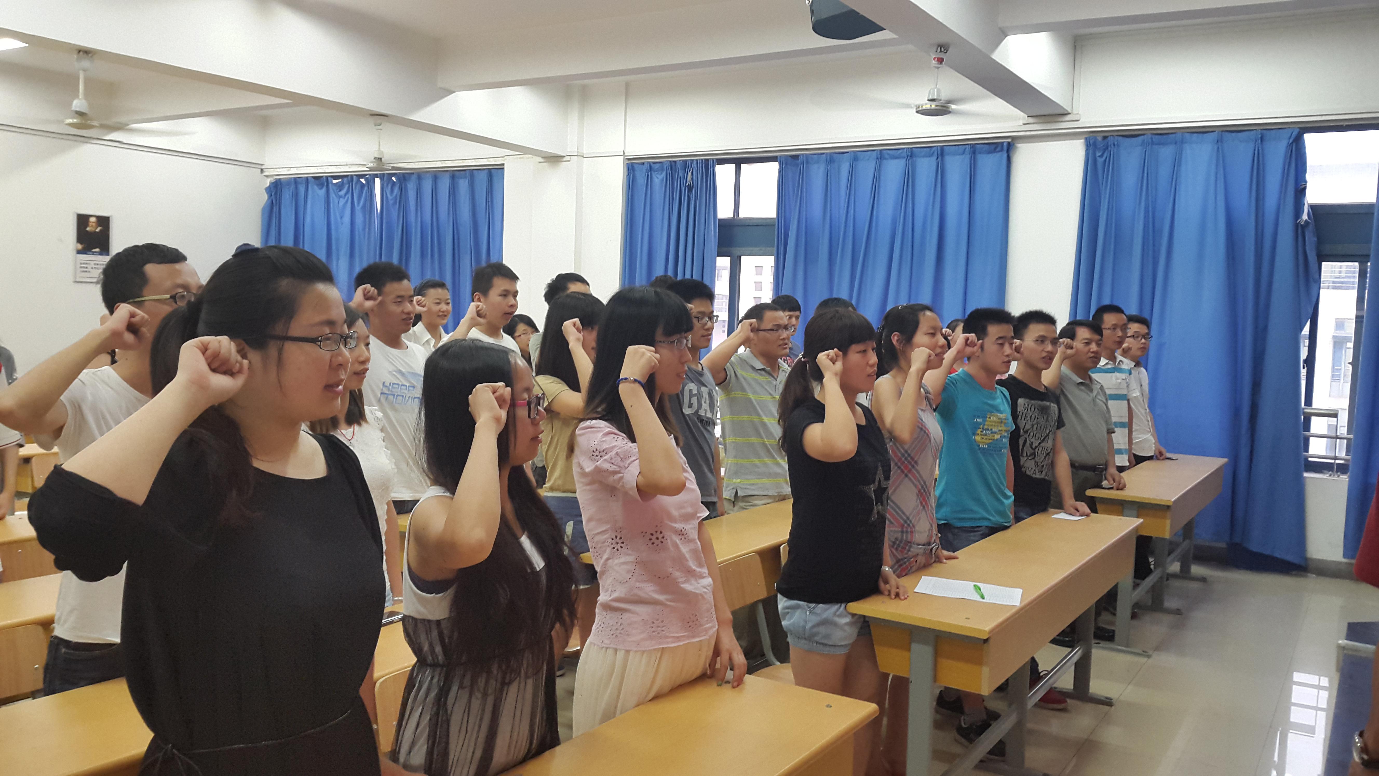 为了切实加强毕业生党员教育,提高毕业生党员的党性修养,激励毕业生党员在文明离校工作中充分发挥模范带头作用。6月10日,麻豆视频 在教3-404教室举行了2014届毕业生党员再教育暨重温入党誓词主题活动。参加人员有院党委副书记于景宝老师,院组织干事、2010级辅导员刘颖老师及2010级本科生支部全体党员。