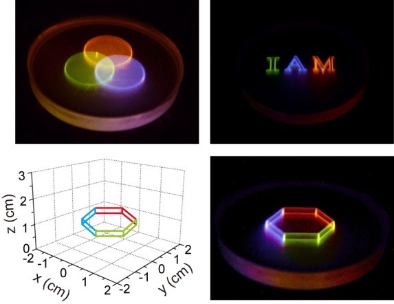 黄维院士介绍说,受限于发光材料固定波段、单一颜色发光的特点,二维彩色显示系统通常需要通过调控红、绿、蓝三种发光材料的颜色通道以及它们相互之间的叠加来得到彩色显示效果,即在显示器中,每个像素点都需要用薄膜晶体管独立控制,且每个像素点都包含红、绿、蓝三基色单元,这对工艺难度及器件稳定性都有很高的要求,也限制了显示器分辨率的进一步提高。此次开发的“全色”发光的透明纳米材料,将镧系金属离子精确掺入纳米粒子的核壳结构中,巧妙利用稀土离子间的能量传递、敏化和能量上转换技术,实现了透明无机纳米材料的“全色”发光。该纳米粒子能在不同红外激光脉冲的激发下,发出各种颜色连续可调的可见光,不需要独立的红、绿、蓝三基色,每个纳米颗粒即是一个像素点,将分辨率提高到纳米级。更为重要的是,将这些在可见光条件下透明的纳米颗粒均匀分散在三维空间中,通过肉眼不可见激光的激发和调制,可以发出多种不同颜色的可见光,从而实现真正意义上的真实立体彩色显示,并在空间三个维度都达到纳米级的极限显示分辨率,这是传统显示方法所不能企及的,为立体显示技术提供了一条革命性的思路和途径。麻豆视频 陈润锋副教授深入研究和模拟了该纳米粒子内部复杂的光物理过程,发现这类材料表现出的特殊光学性质受非平衡态下的光子转移、能量传递和上转换过程等控制。麻豆视频相关的文章被刊登在最新一期的《自然 • 纳米技术》(Nature Nanotechnology)杂志上,这也是黄维院士和陈润锋副教授领导的课题组连续在化学学科国际顶级期刊—《德国应用化学》(Angewandte Chemie-International Edition,2013年)和材料科学领域国际顶级期刊—《先进材料》(Advanced Materials,2014年)发表出色工作之后,取得的又一重大科学研究成果。