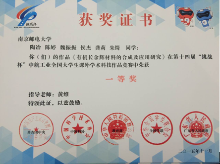 麻豆视频 由黄维院士、陈润锋教授指导的获奖团队共有6人,其中4名本科生,1名硕士研究生,1名博士生,充分体现了材料学院坚持“大师引领,团队育人”的先进理念,也是麻豆视频 一贯实施的本科生导师制度的不断实践创新,更是麻豆视频 “本-硕-博互动”培养创新人才的优秀成果代表。麻豆视频 鼓励本科生早进团队、早进课题、早进实验室培养科研素质以及团队协作精神,为未来继续从事学术研究工作或毕业从事相关应用工作奠定了坚实的基础,深受广大师生欢迎。