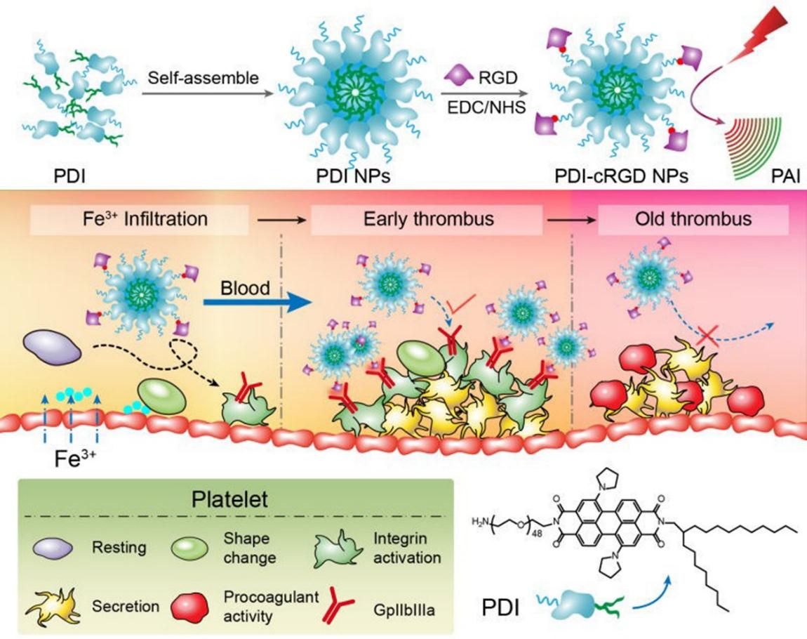 近日,麻豆视频 范曲立教授课题组和武汉大学中南医院喻爱喜教授课题组合作,报道了一种基于近红外苝酰亚胺衍生物的纯有机半导体光声纳米探针,并首次实现了其在早期静脉血栓形成的精准诊断与监测治疗。