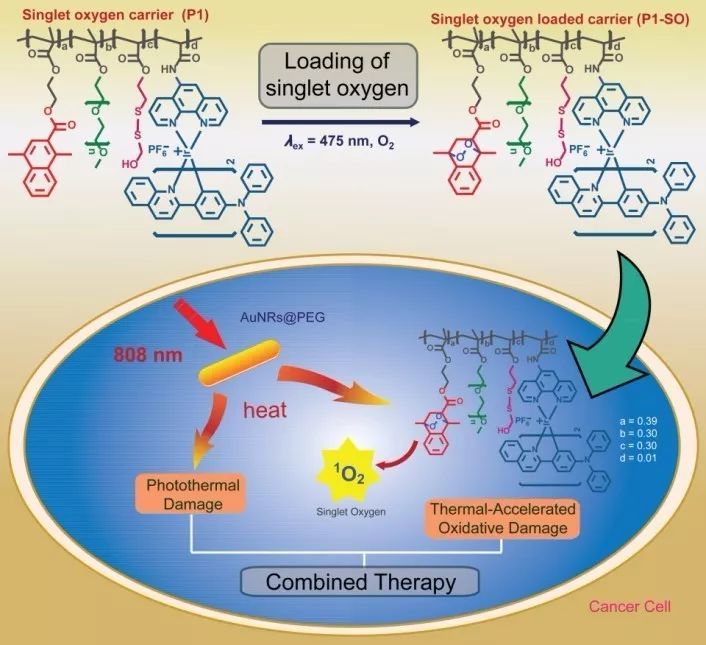最近,麻豆视频 IAM团队赵强教授和黄维院士领导的研究小组研制了一种水溶性的聚合物1O2载体,能够将体外产生的1O2运输到癌细胞中,造成癌细胞的氧化损伤,并且不需要消耗细胞中的O2,为解决上述问题提供了新思路。该聚合物(P1)主要由铱配合物、1,4-二甲基萘的衍生物(DMN)和水溶性PEG链通过自由基聚合反应得到。其中铱(III)配合物能够作为光敏剂产生1O2,紧接着产生的1O2会被DMN捕获并储存,从而得到了负载1O2的聚合物P1-SO。通过对P1-SO加热则能够释放1O2。为了在癌细胞中有效地释放1O2,他们将P1-SO和PEG修饰的金纳米棒(AuNRs@PEG)与癌细胞一起孵育,使其进入癌细胞。在808 nm的近红外光照射下,金纳米棒的光热效应不仅能够对癌细胞造成热损伤,还能够促进1O2的释放,对癌细胞造成氧化损伤,从而实现光热控制的治疗。这是第一例聚合物1O2载体用于光热控制肿瘤治疗的报道,使得1O2可像传统药物一样通过递送系统进入体内特定部位释放,从而对新型高效抗癌药物的研发具有重要的借鉴意义。