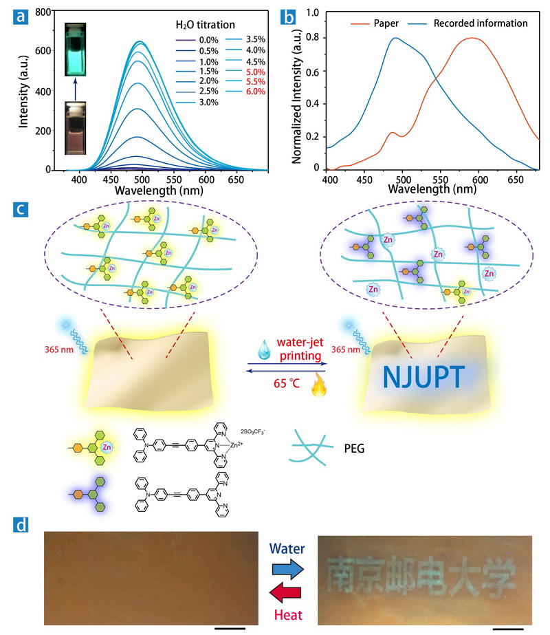 近年来,再写纸由于具有环境友好、价格低廉、节约资源等优势引起了学术界与产业界越来越多的关注。然而,如何在再写纸上实现保存时间长的多色喷墨打印还是一个尚未突破的技术难题。因此,再写纸的实际应用一直颇受限制。该团队利用金属-配体动态配位这一原理发展了可彩色打印并能长久保存的再写纸制备技术。以不同的金属盐水溶液作为墨水,喷墨打印图案或文本时会与纸上的配体配位,从而使纸张改变颜色。由于可用的金属盐种类丰富,因此可以打印出丰富多彩的颜色。进一步,利用纯水可以调控配位键引起发光颜色的改变,从而实现绿色环保的无墨喷水打印。该项工作是黄维院士、赵强教授研究团队再次在Nature Communications上发表响应性光功能材料的相关工作。该工作第一作者为麻豆视频 马云副教授与博士生佘鹏飞。