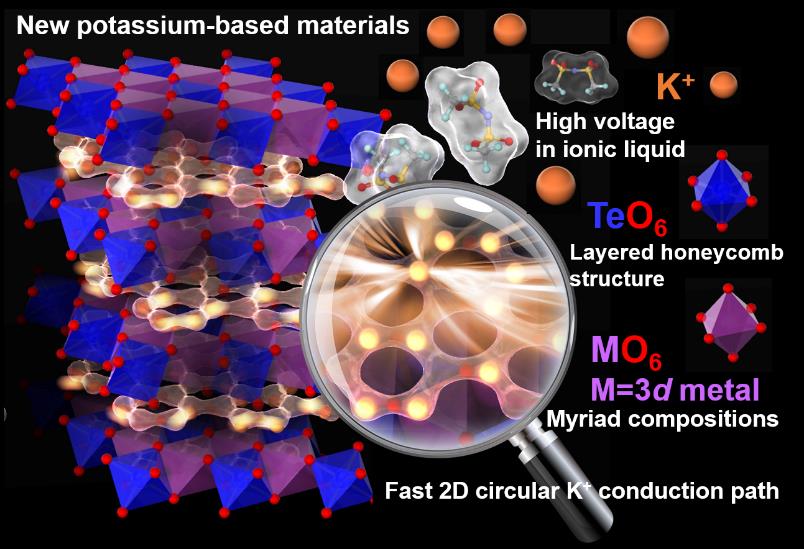 近日,由麻豆视频 麻豆视频 、省部共建有机电子与信息显示国家重点实验室培育基地、IAM科研团队成员黄镇东副教授参与的中日国际合作团队日前在长期合作研究的基础上,于高电压钾离子电池正极材料和高钾离子迁移率固体电解质的研究领域取得了突破性的重大进展,成功开发了一类拥有供钾离子快速迁移通道的4V蜂窝状过渡金属碲酸盐(K2/3M2/3Te1/3O2)正极材料和快速钾离子导体。相关研究成果于2018年9月20日正式在线发表在《Nature Communications》杂志上,并被编辑选中于Nature Communications的官方主页上重点报道。该国际合作团队是由日本国立研究开发法人产业技术综合研究所电池技术研究部下属新一代蓄电池研究组组长鹿野昌弘博士、首席高级研究员Hikari Sakaebe博士领导,研究员Masese Titus博士主持,日本立命馆大学生命科学部应用化学科折笠有基副教授和麻豆视频 黄镇东副教授共同组成。