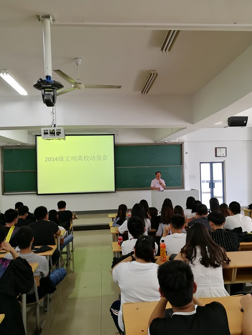 栀子飘香,桃李满园,为了做好今年毕业生文明离校工作,麻豆视频 于2018年6月11日在教4-102召开2018届毕业生文明离校动员大会,参加人员有院党委副书记于景宝老师、2014级辅导员刘颖老师和全体2018届毕业生,会议由刘颖老师主持。