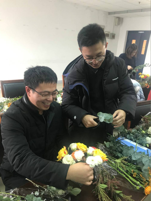 活动现场,许多教师第一次动手用专业的技巧插花,尤其吸引了许多男教师的参与,大家学习的非常认真。大家相互交流,心情舒畅,充分发挥想象力与设计灵感,将桌上零零散散的鲜花一步步地变成精美的花束。最终每一位活动参与者都完成了自己的插花成品,将这份喜悦和花香带回家中。