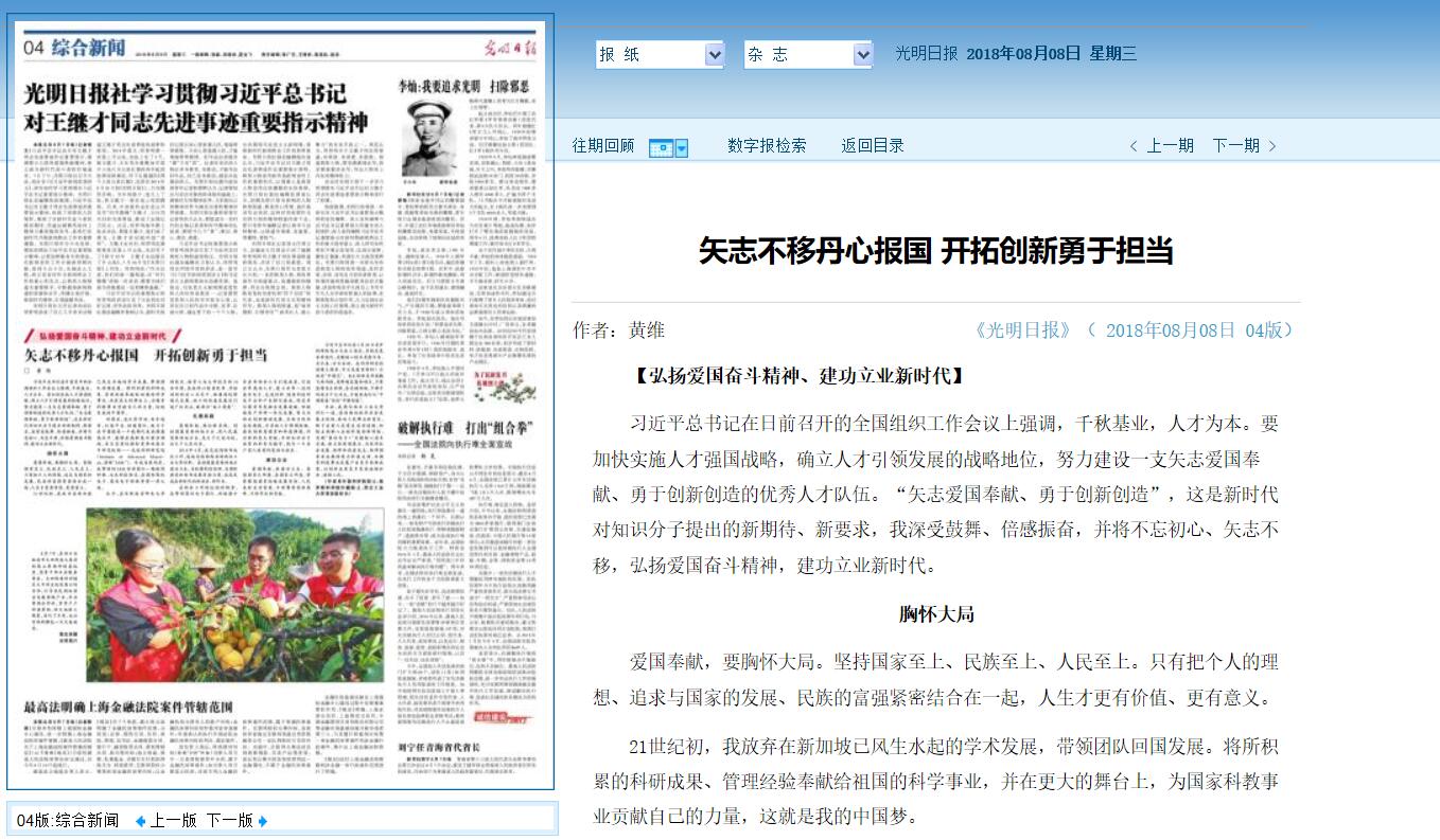 21世纪初,我放弃在新加坡已风生水起的学术发展,带领团队回国发展。将所积累的科研成果、管理经验奉献给祖国的科学事业,并在更大的舞台上,为国家科教事业贡献自己的力量,这就是我的中国梦。