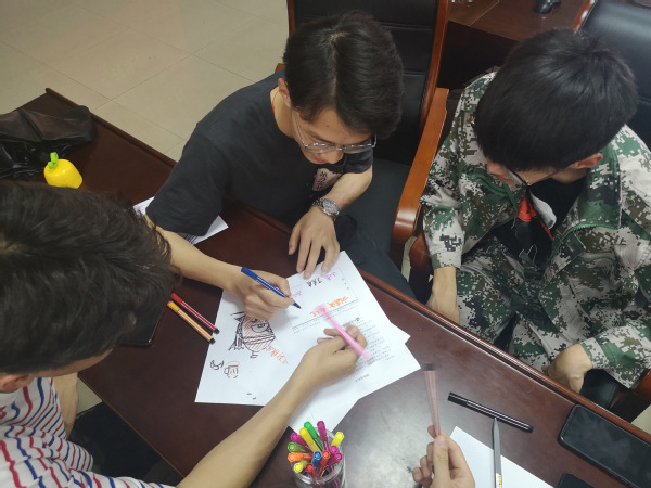 分组结束,每个小组的成员开始用彩笔绘制自己的名片,有的同学把自己想象成超级英雄,有的同学把自己画成可爱的美少女,大家互相介绍自己的名片,现场不时爆发出欢笑声,分享结束后,由小组长向大家介绍组员。