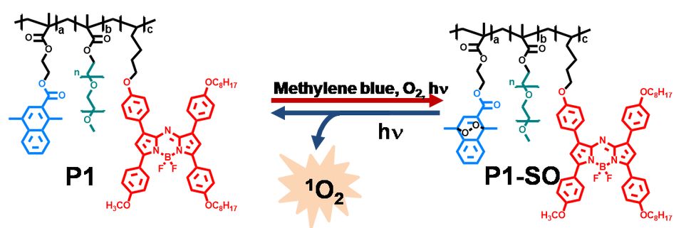 黄维院士和赵强教授课题组设计了一种新型的聚合物单线态氧载体(P1),如图1所示。该聚合物由1,4-二甲基萘的衍生物(DMN)、氮杂氟化硼二吡咯化物(B1)和水溶性的聚乙二醇(PEG)构成。其中,DMN能与单线态氧反应生成内过氧化物且在受热时释放出单线态氧,B1由于其较大的摩尔消光系数和较强的近红外吸收、发射,使其不仅能作为光热试剂,还是一种良好的近红外成像试剂,可有效增强组织穿透深度。同时,PEG的引入提高了聚合物载体的水溶性,也增强了对肿瘤组织的靶向性。