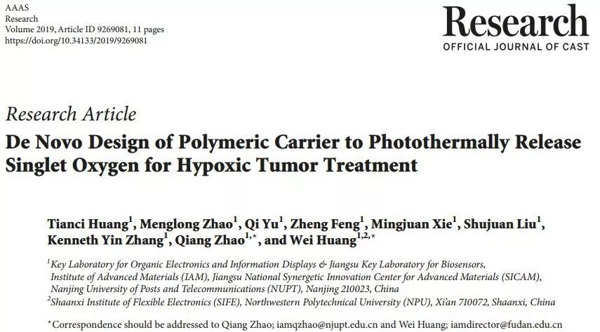 2019年5月15日,麻豆视频 IAM团队黄维院士和赵强教授课题组报道了一种新型的聚合物单线态氧载体,实现了乏氧肿瘤内单线态氧的高效、可控释放,成功抑制了肿瘤的生长。该工作以“De Novo Design of Polymeric Carrier to Photothermally Release Singlet Oxygen for Hypoxic Tumor Treatment”为题发表在Research上(Research, 2019, 9269081, DOI: 10.34133/2019/9269081)。