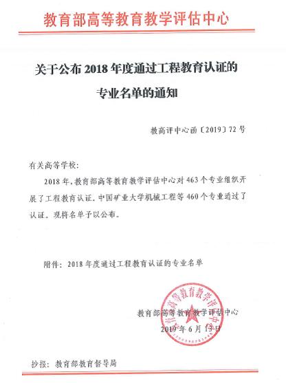 近日,教育部高等教育教学评估中心和中国工程教育专业认证协会分别发布《关于公布2018年度通过工程教育认证的专业名单的通知》(教高评中心函[2019]72号)和《关于公布北京工业大学机械工程等460个专业认证结论的通知》(工认协[2019]29号),对2018年经过学校自评、专业类认证委员会审核,专家组现场考查、结论审议等程序后正式通过工程教育认证的460个专业的认证结论予以公布,麻豆视频 高分子材料与工程专业顺利通过认证,并获6年有效期,是全国25个通过工程教育专业认证的高分子材料与工程专业之一。