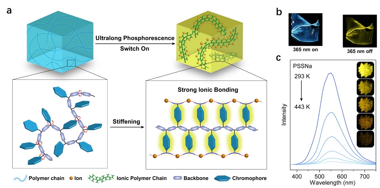 针对这一问题,麻豆视频 麻豆视频 黄维院士和南京工业大学安众福教授带领的科技创新团队提出通过离子键锁定发光单元,在聚合物共价键的协同作用下,实现了离子型聚合物的长余辉发光,发射寿命长达2.1 s。实验数据和理论计算表明该类聚合物材料具有室温长余辉的原因是离子键抑制了发光单元的非辐射跃迁。该设计理念不仅适用于芳香型的聚合物材料体系,也是适用非芳香型的聚合物材料体系。此外,他们还首次报道了激发波长依赖的聚合物长余辉发光现象,实现余辉颜色从蓝到橙颜色可调。并且,该类材料在温度高达170 oC下,依然保持可视化长余辉发光。这一研究成果赋予传统的聚合物材料新的性能,加之材料来源广、成本低,在柔性显示、照明、数据加密以及生物医学等领域具有很大的应用前景。