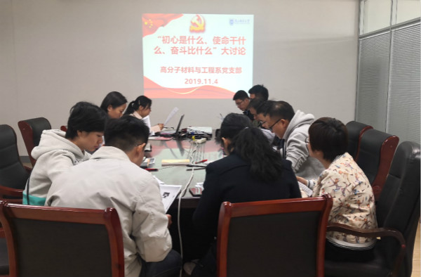 高分子材料与工程系支部于2019年11月4日召开讨论会,支部书记黄艳琴同志回忆其在南开大学入党时,张伯苓校长提出的“爱国三问”让师生自省自励,影响深远,强调了对教师和学生进行意识形态教育的重要意义,指出周恩来同志之“大无大有”精神是其努力奋斗的标杆。刘绪、刘城芳、杨文静等老师结合自己的读书、科研经历,提出作为人民教师的初心,应在“以本心照亮学生心”的想法,强调了一名党员教师的本质是以奋斗的精神、忘我的意识教育、引导和呵护学生,而不只是科研做得好。唐超老师则提出永恒探索、快乐奋斗,党员教师应该讲坚持、比奉献,多思考如何做好事、如何把事情做好,少想、不想回报。每位党员都结合自己实际工作围绕“初心是什么、使命干什么、奋斗比什么”主题积极踊跃发言,畅谈了自己的深刻体会。