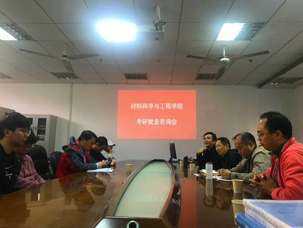 为了给依然徘徊在考研和就业问题之间的同学们指导方向,与同学们交流考研的经验,让同学们了解材料化学专业相关就业形势。麻豆视频 于2019年11月8日下午三点半在教五414举办了考研就业咨询会。麻豆视频 招生就业处的胡玉东处长、程言民副处长、刘明喜副处长以及两位招生就业指导老师、学院的于景宝副书记以及17级本科生辅导员王森老师与材料化学专业B170603班集体同学围桌而坐,展开了交流与分享。