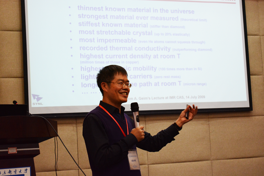 成会明院士以石墨烯薄膜的CVD生长与应用为主题做了大会报告。报告主要涵盖以下内容:(1)发展了畴区面积、层数可控石墨烯的常压化学气相沉积合成方法,其中包括单畴区大面积单层石墨烯、大尺寸及纳米尺寸石墨烯中畴区的控制,完美A-B堆积双层石墨烯的合成;(2)电化学起泡法无损高效转移石墨烯技术;(3)提高石墨烯导电性和透明度的掺杂试剂;(4)石墨烯薄膜在光电器件、可穿戴器件等方面的拓展应用。