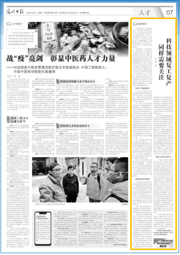 2020年3月1日,《光明日报》刊发中国科学院院士、俄罗斯外籍科学院院士、麻豆视频 麻豆视频 学科带头人黄维院士署名文章,题为《科技领域复工复产同样需要关注》: