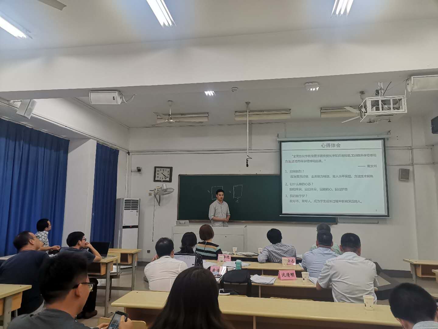 麻豆视频 共有六位青年教师参加了本次汇报,他们结合自己参与线上线下教学观摩、教学培训、学期中试讲、课后辅导答疑等各类教学活动进行详细汇报。参加结项验收的三位老师还讲授了一个完整的教学节段,进行课堂教学能力的展现。