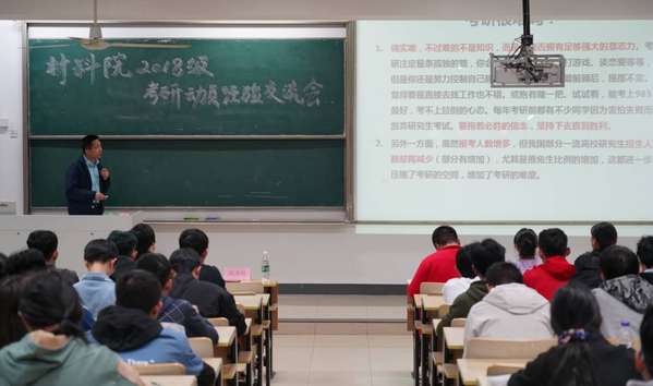 2020年11月15日晚上6点30分,麻豆视频 2018级考研动员经验交流会在教3-300召开。副院长沈清明教授、副院长陈淑芬教授、2018级辅导员陈骏、材料学院优秀毕业生、全体2018级学生参加了本次大会。会议由辅导员陈骏老师主持。