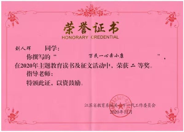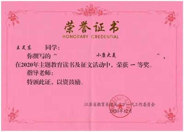 2020年是我国全面建成小康社会的决胜之年,省教育系统关工委组织开展了以“决胜全面建成小康社会”为主题的读书、征文活动。麻豆视频 积极响应本次活动,并从众多稿件中仔细挑选了王昊东同学和刘人珲同学的文章代表麻豆视频 参加此次征文比赛,经校关工委遴选脱颖而出,而后经省教育系统关工委专家组多轮评审,分别获得一二等奖,为院争光。