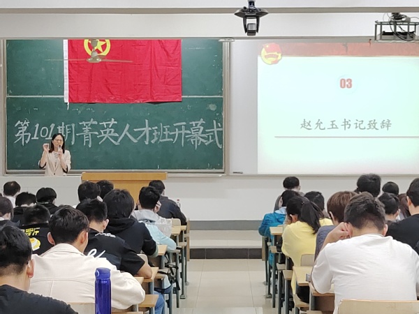 本次菁英班在国歌声中拉开帷幕。赵书记首先为开班仪式致辞,她代表学院党委对本次培训班的顺利开班表示祝贺。赵书记指出,2021年是中国共产党成立100周年,是“十四五”规划开局之年,也是全面建成小康社会、开启全面建设社会主义现代化国家新征程的关键之年,希望学员们能够充分利用这次菁英人才班的学习和实践机会,潜心学习,刻苦钻研,有所收获。同时,赵书记对学员们提出了“人在心在,脚踏实地”,“端正态度,认真学习”,“结合自身,明确目标”的三点希望,切实提高自身的理论知识水平和实践能力。