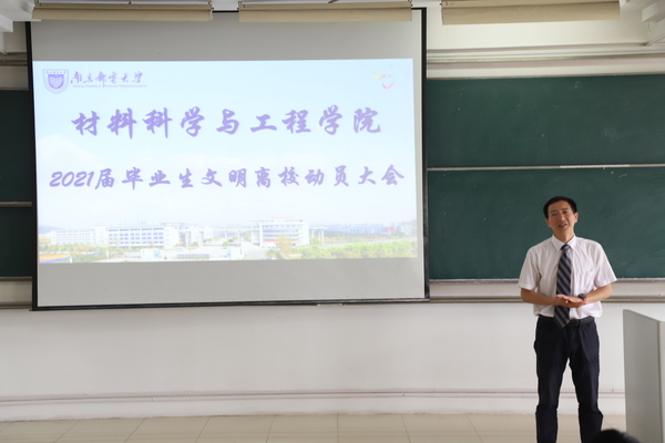 张建平副书记首先代表学院对即将毕业的同学们表示祝贺,对大家在校四年期间的表现表示肯定并感谢各位同学四年来对学院、学校各项工作的理解和支持。鼓励同学们要学会适应新的岗位和环境,要把材料院敢于拼搏的精神延续到今后的学习、工作和生活中。强调毕业生应该有社会责任感、加强自律意识,站好最后一班岗,做到安全文明离校。希望全体毕业生高度重视毕业离校各项工作,按照学校规定的进程认真对待毕业前需要学生自己办理的一切事务。努力营造“文明、安全、和谐、有序”离校的良好环境和氛围,确保各项工作有条不紊地开展。
