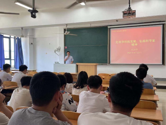 2021年6月22日,麻豆视频 党委委员、副院长陈润锋在教4-311为学院博士生党支部、生物电子研究所党支部全体党员讲授“党领导科技发展,弘扬科学家精神”主题党课。