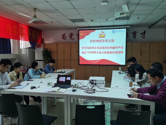 10月27日下午,麻豆视频 材料物理系党支部在仙林校区教5-101会议室召开支部党员大会,支部党员集中学习了习近平总书记在庆祝中国共产党成立100周年大会上的重要讲话精神、中国共产党统一战线工作条例,并开展了课程思政教学研讨。