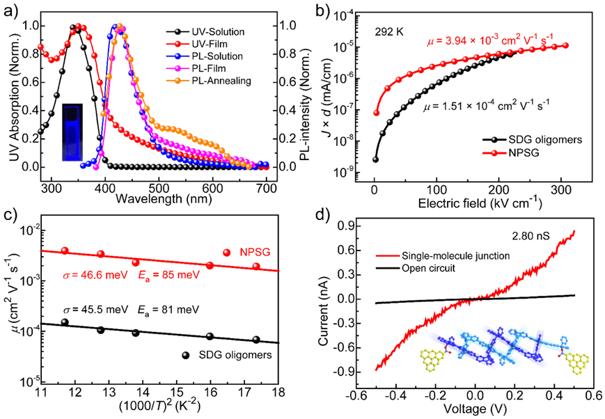 图2.聚螺格的光电特性及载流子迁移率