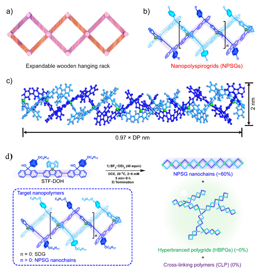 受人观尺度的剪式升降机(Scissor Lift)、菱形可伸缩挂衣架模型(Retractable coat hanger)以及电动伸缩门(Electric shrink gate)和分子世界的双链DNA结构的启示,设计了新一代有机纳米聚合物,即有机纳米聚菱形格或者称之为有机纳米聚螺格。该类一维度共价纳米有机材料不仅展示了结构新颖、合成简单,而且在物化与光电特性表现出卓越的特性。在10-105Hz范围内,该类聚螺格拥有介电常数高达8.43,接近无机宽带隙GaN半导体(9.0),这说明经过纳米螺格子化策略改造π-分子系统后形成的有机纳米聚合物有望展现出类无机半导体材料的光电属性。
