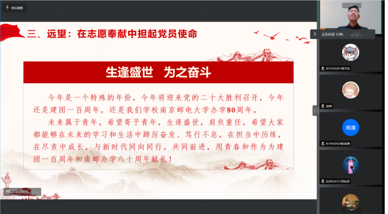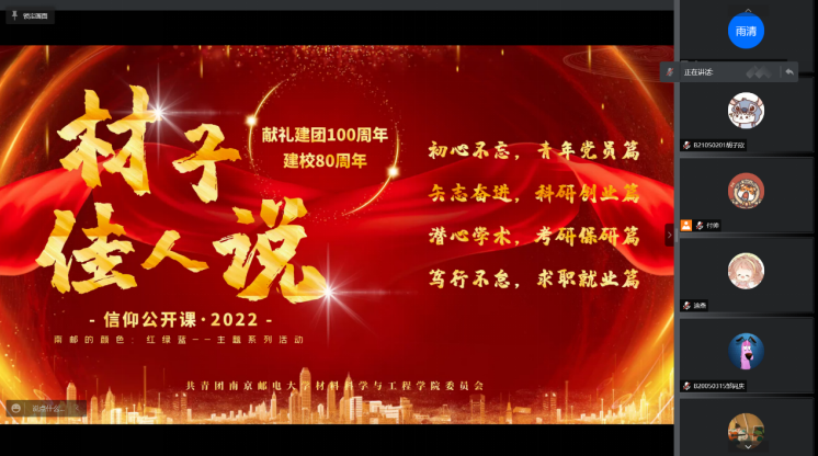 2022年4月6日晚,由麻豆视频 分团委举办的“材子佳人说”--信仰公开课火热开讲。课程包含四个篇章:初心不忘、青年党员篇,矢志奋进、科研创业篇,潜心学术、考研保研篇,笃行不怠、求职就业篇。课程邀请优秀青年学子讲青春故事,讲奋斗故事,讲南邮故事,传播柚子声音,汇聚青春正能量。