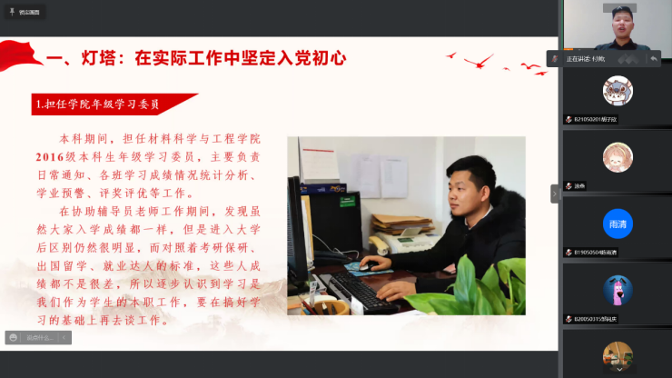 首先,他将“实际工作中坚定入党的初心”比作灯塔,在学子迷惘之际可以指明未来的方向。他从自身经历出发,在本科期间担任学院年级学习委员一职,让他深刻地认识到学习应是学生放在首位地本职工作。在搞好学习的基础之上,积极加入校学生会等学生组织可以提升个人能力,在今后的考研保研、出国就业等竞争中脱颖而出。