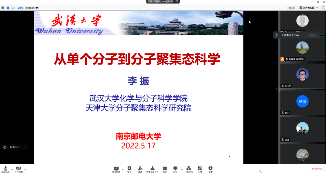 承国脉,薪火相传八十载;创未来,弘毅笃行谱新篇。值此南邮八十华诞校庆学术活动月之际,应麻豆视频 和前沿信息技术与产业发展研究中心陈润锋教授邀请,武汉大学/天津大学李振教授于2022年5月17日(周二) 上午10:00(周二)在腾讯会议和腾讯直播上为师生作了以“浅谈从单个分子到分子聚集态科学”为主题的学术报告。陈润锋教授主持了报告,线上共有近100名师生参加。