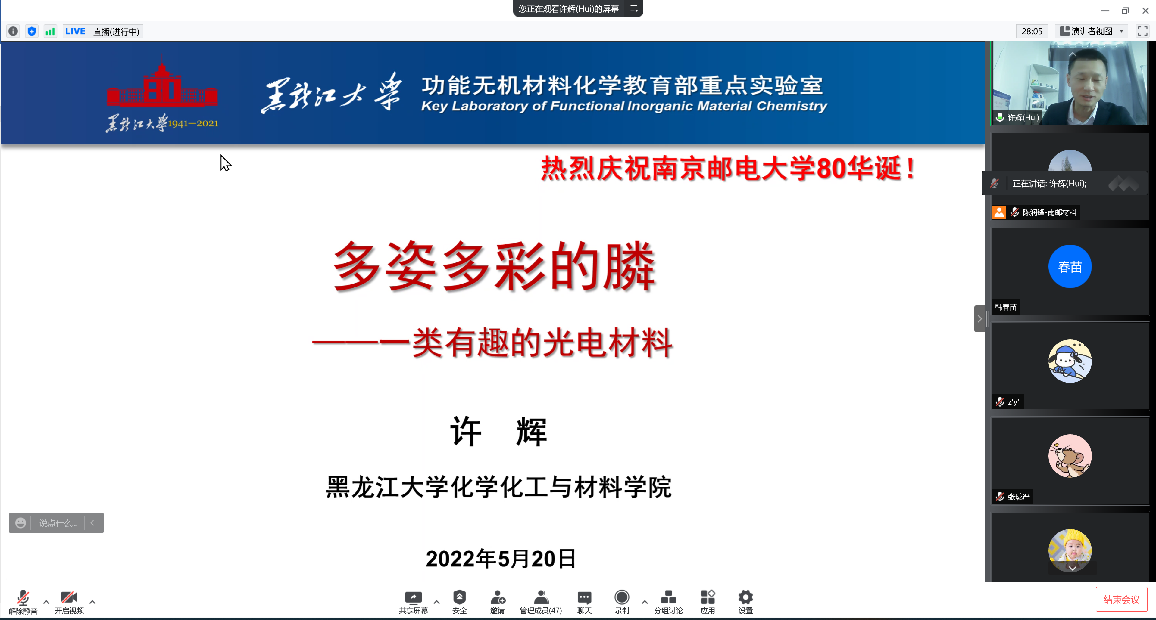 承国脉,薪火相传八十载;创未来,弘毅笃行谱新篇。值此南邮八十华诞校庆学术活动月之际,应麻豆视频 陈润锋教授邀请,黑龙江大学许辉教授于2022年5月20日(周五)下午14:00在腾讯会议和腾讯直播上为师生作了以“多姿多彩的膦——一类有趣的光电材料”为主题的学术报告。陈润锋教授主持了报告,线上共有近100名师生参加。