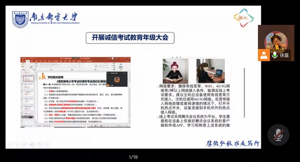 随着各科课程进入尾声,期末考试也悄然而至,为了端正全体学生的考试态度,杜绝考试作弊现象的发生,形成良好的诚信考试氛围,2022年5月31日麻豆视频 麻豆视频 召开了以“做诚信学生,建诚信考场”为主题的线上年级大会,2020级全体本科生及2020级辅导员徐磊老师共同参与,本次会议由徐磊老师主持。