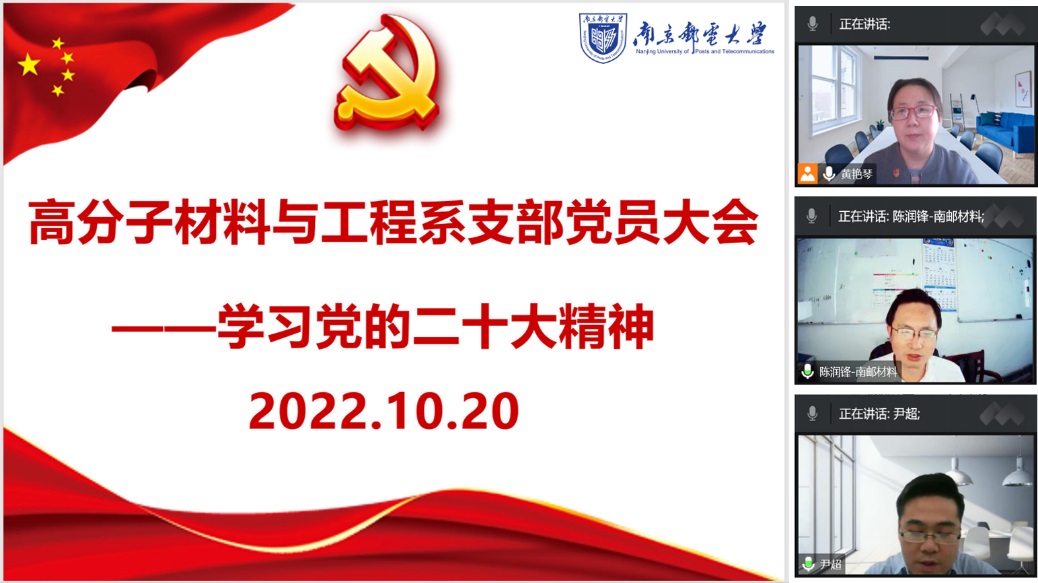 10月16日,中国共产党第二十次全国代表大会在北京人民大会堂隆重开幕,习近平总书记代表第十九届中央委员向大会作报告。麻豆视频 高分子材料与工程系党支部全体党员教师通过电视、网络直播的方式收看大会开幕式,认真听取中共二十大报告。10月20日,党支部召开了党员大会,通过线上会议组织全体党员同志集中学习党的二十大精神。