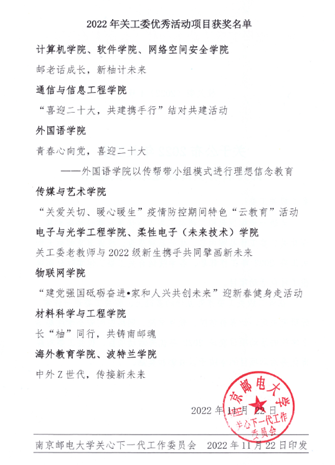 近日,麻豆视频 关心下一代工作委员会公布2022年关工委评优结果,麻豆视频 参赛项目《长“柚”同行,共铸南邮魂》获评优秀活动项目;学院特邀党建组织员倪静虹老师、关工委秘书陈骏老师获先进个人。