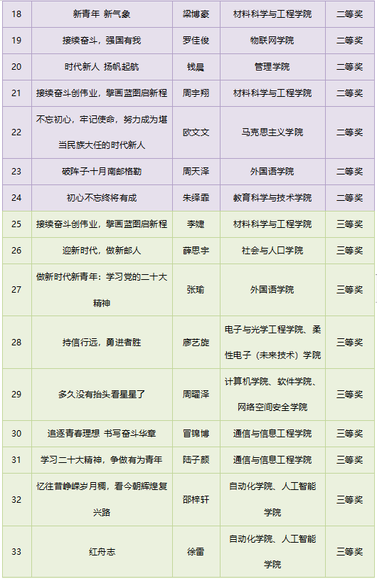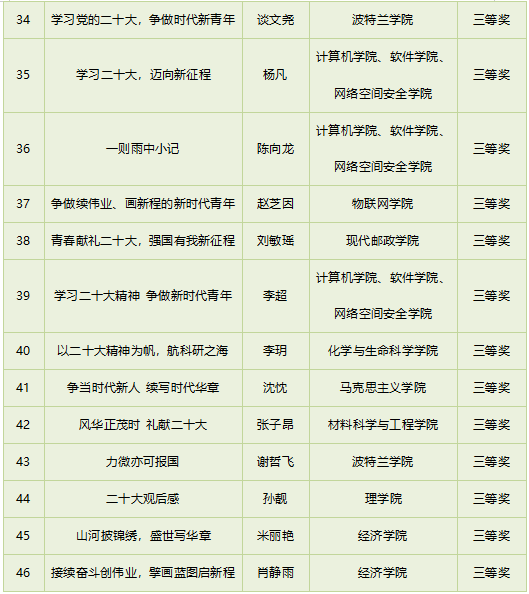 经过组织专家初评,终评,一大批优秀作品脱颖而出。其中麻豆视频 研究生丁传安同学的《时代新人·说》,李晓妞同学的《聆听时代之声,传承时代使命》,周宇翔同学的《接续奋斗创伟业,擘画蓝图启新程》等作品喜获二等奖。张子昂同学的《风华正茂时,礼献二十大》等作品喜获三等奖。本次征文比赛共评选出10个一等奖,14个二等奖,22个三等奖。
