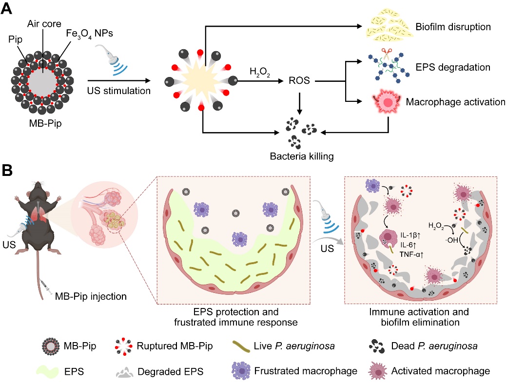 针对以上问题,该团队构建了由四氧化三铁纳米颗粒(Fe3O4 NPs)和抗生素哌拉西林(Pip)组成的超声响应载药催化微泡(MB-Pip)用于铜绿假单胞菌生物膜的清除。在超声作用下,MB-Pip产生惯性空化作用,通过机械效应扰乱生物膜结构,释放的Fe3O4 NPs可催化降解胞外基质,实现物理/化学双模式的生物膜破坏,有效增强药物的渗透和抗菌性能。此外,Fe3O4 NPs可激活巨噬细胞向M1表型极化,增强巨噬细胞的杀菌能力,实现小鼠铜绿假单胞菌慢性肺炎的高效治疗,为解决临床细菌生物膜感染难题提供了新的研究思路。