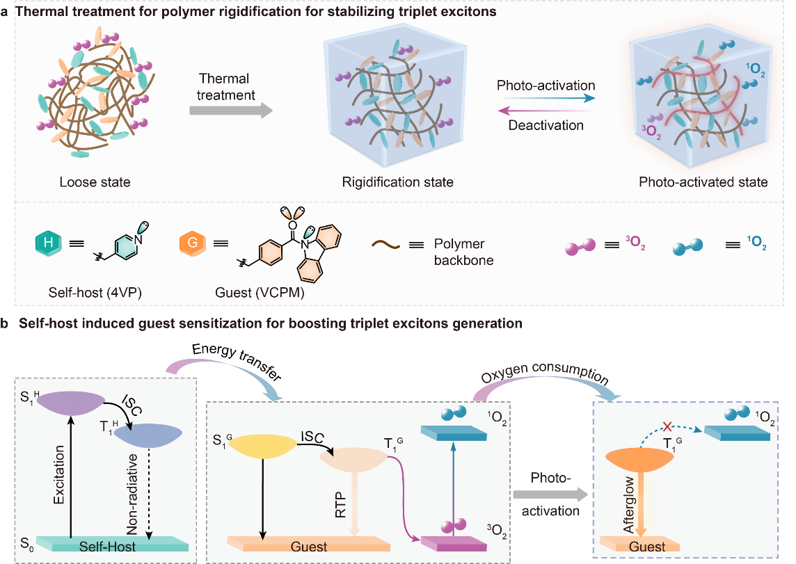 刺激响应性有机长余辉材料,由于其自身结构和功能在外部环境的刺激作用下可以动态地转变或调节,从而实现对外部环境做出恰如其分的响应,展现出动态可调的光电性质,使其在逻辑运算与数据存储、光编码与分子开关、防伪纸与安全墨水等领域受到了广泛的研究关注。然而,目前刺激响应性有机长余辉通常只能在小分子晶体和和主客体掺杂的多组分体系中实现,如何构建具有刺激响应特性的单一组份聚合物长余辉材料仍然是一个难题。