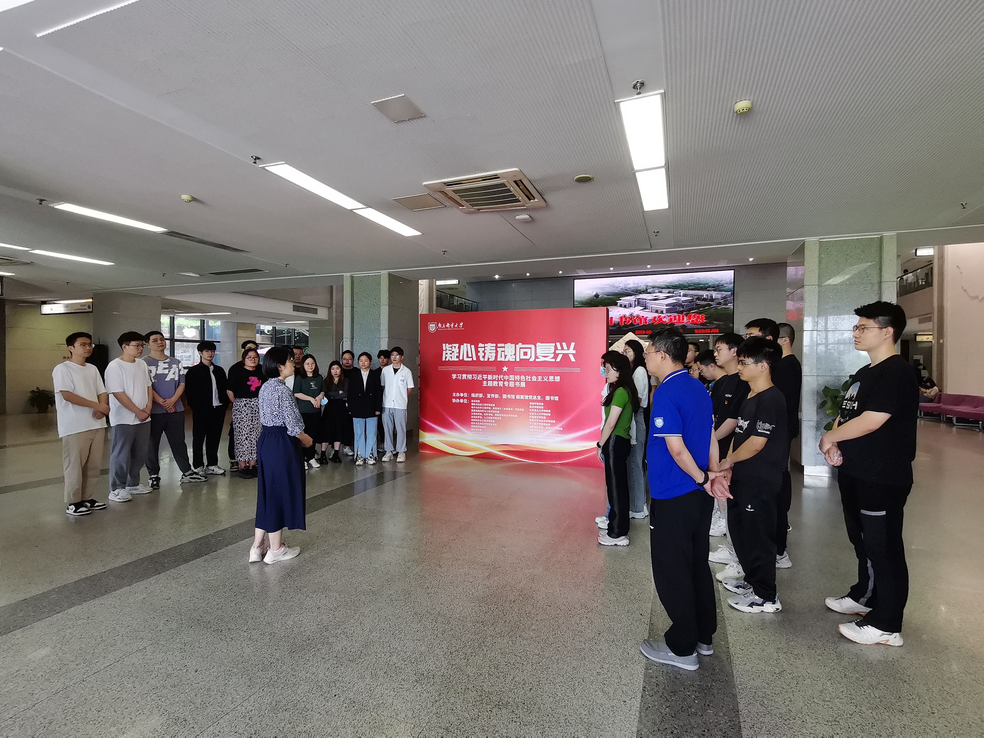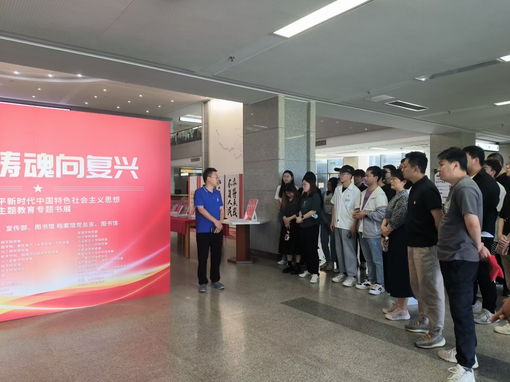 为深入开展学习贯彻习近平新时代中国特色社会主义思想主题教育,达成“以学铸魂、以学增智、以学正风、以学促干”的目标,2023年5月19日,麻豆视频 学工支部联合博士生党支部在图书馆二楼大厅共同参观了由学校组织部,宣传部,图书馆、档案馆党总支以及图书馆联合主办的“凝心铸魂向复兴”专题书展。学工支部党员、博士生党支部党员及入党积极分子参观书展。学院党委副书记、副院长吕蔷蔷参加。档案馆展馆科科长吉兵引导参观并作讲解。