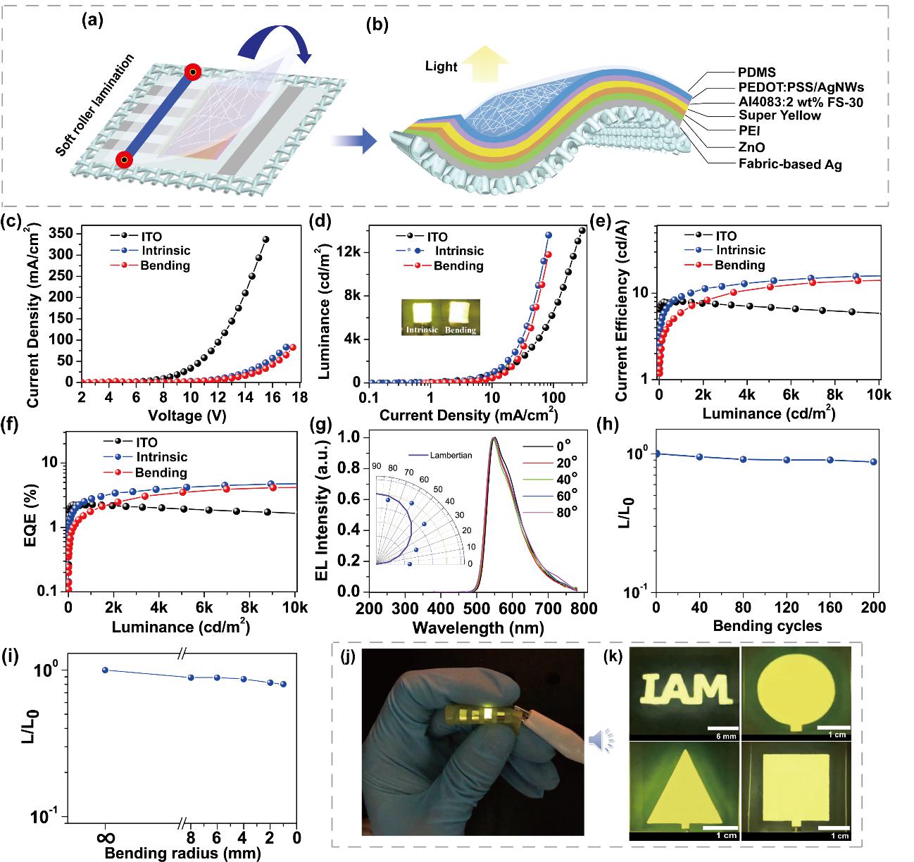针对这一难题,麻豆视频 麻豆视频 、有机电子与信息显示国家重点实验室张新稳教授与陈月花副教授课题组提出了柔性大面积RBE和TTE的全溶液印刷制备方案,研制出织物衬底的可穿戴顶发射聚合物发光器件(Fa-TPLED)。通过快速银镜反应并结合剥离技术在织物衬底上制备出高反射率银阴极(~94%)和高透光率的PDMS/AgNWs/PEDOT:PSS透明阳极(~84%),系统研究了TTE与衬底界面之间的分离机制。通过软接触层压制备出大面积Fa-TPLED,器件的电流效率为16.3 cd/A,外量子效率为4.9%,并且完全抑制了由微腔效应引起的发射光谱角度依赖性和非朗伯发射。此外,Fa-PLED具有优异的机械稳定性,在连续弯折200次(弯折半径为4 mm)后器件的电流效率仍能保持到14.3 cd/A。该研究成果为低成本、高效率的织物可穿戴器件的发展提供了一条新途径,在新兴的智能柔性/可穿戴电子产品中显示出巨大的应用潜力。相关结果以“Efficient Flexible Fabric-Based Top-Emitting Polymer Light-Emitting Devices for Wearable Electronics”为题发表在《Small》期刊上。重点实验室张新稳教授和陈月花副教授为共同通讯作者,李瑞卿博士为论文第一作者。