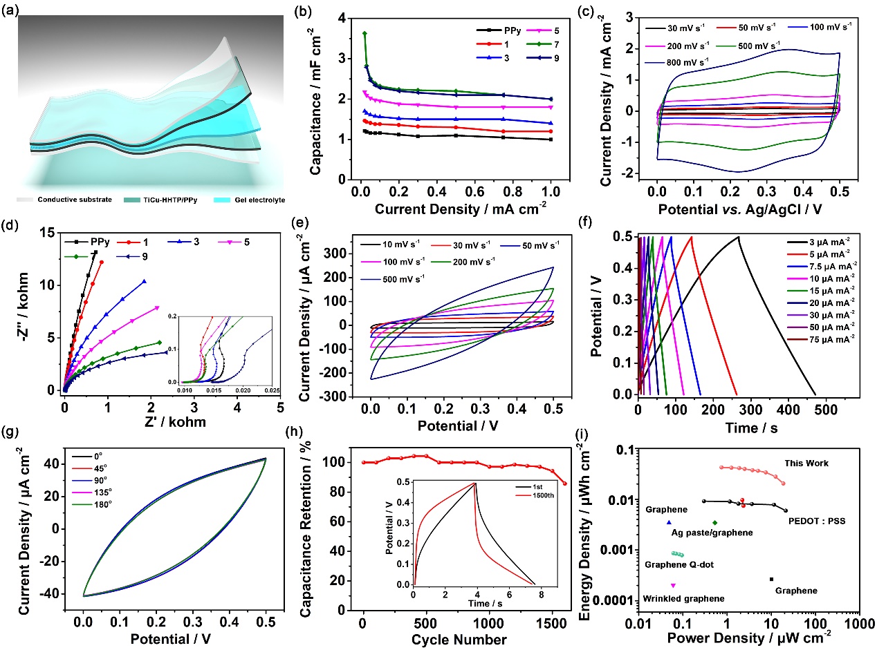 近日,南京邮电大学麻豆视频 、有机电子与信息显示国家重点实验室赵强教授、赵为为副教授团队和中科院福建物质结构研究所袁大强教授团队合作,提出了一种金属离子辅助转化策略,以二维Ti3C2Tx为前驱体,合成了具有非互穿srs框架的基于儿茶酚的三维TiCu-HHTP(HHTP = 2,3,6,7,10,11-六羟基三苯)MOF,成功扩展了耐酸性金属前驱体和有机配体的多样性。该策略表现出了良好的普适性,Ti3C2和辅助金属Cu2+离子可以扩展到V2C MXene和辅助金属离子Mn+(M = Ni2+、Co2+、Mn2+和Zn2+)。转化机制包括从Ti3C2纳米片到辅助金属离子的电荷转移、Ti-C键断裂以释放Ti4+离子以及Ti4+/Mn+与HHTP之间的强螯合配位协同促进形成TiCu-HHTP。同时,Cu2+离子的引入赋予了TiCu-HHTP表面氧化还原赝电容活性。独特的3D导电网络和丰富的氧化还原位点赋予了TiCu-HHTP-7/PPy复合透明导电电极(TCEs)快速的离子/电子传输和可逆的法拉第反应。在0.02 mA cm-2电流密度下,TiCu-HHTP/PPy TCEs的面积比电容值达到3.63 mF cm-2,明显高于纯PPy TCEs的面积电容值(1.79 mF cm-2)。TiCu-HHTP/PPy透明超级电容器在0.75 µW cm-2的功率密度下,能量密度为0.042 µWh cm-2。
