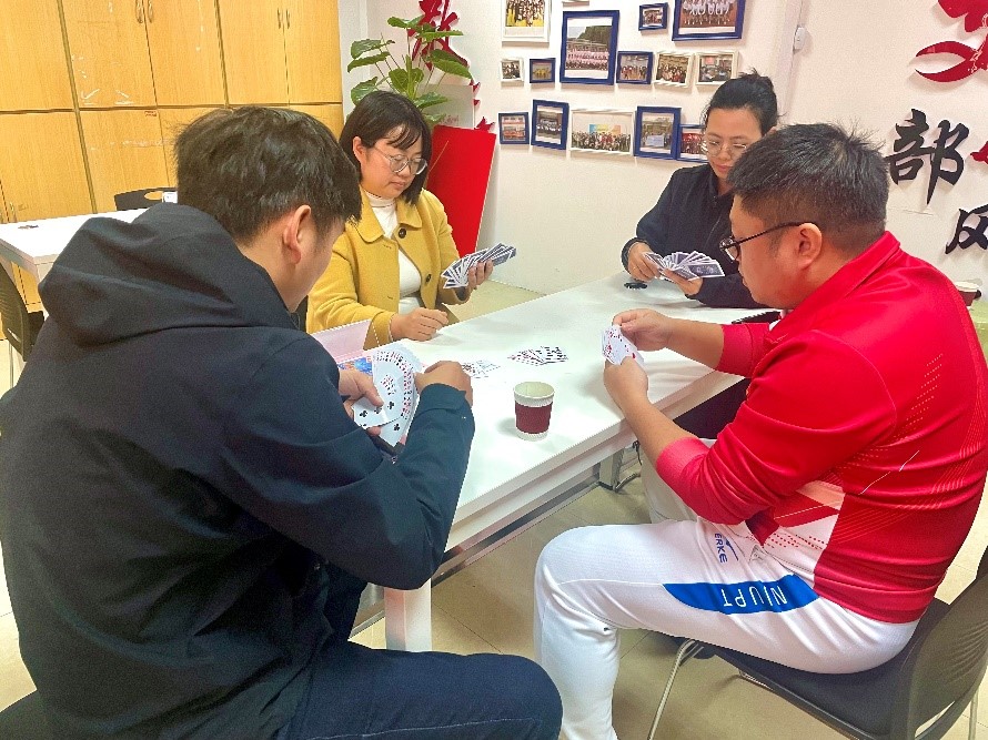 为了增进材料院教职工之间的交流联系,丰富和活跃教职工业余文化生活,增强教师团队的凝聚力与合作意识。2023年11月16日中午,材料院分工会在材料学科楼101活动室举办了教职工扑克牌“掼蛋”选拔赛。教师们积极参与,踊跃报名,本次活动共有20人参加比赛,选拔4人代表材料院分工会进入学校决赛。