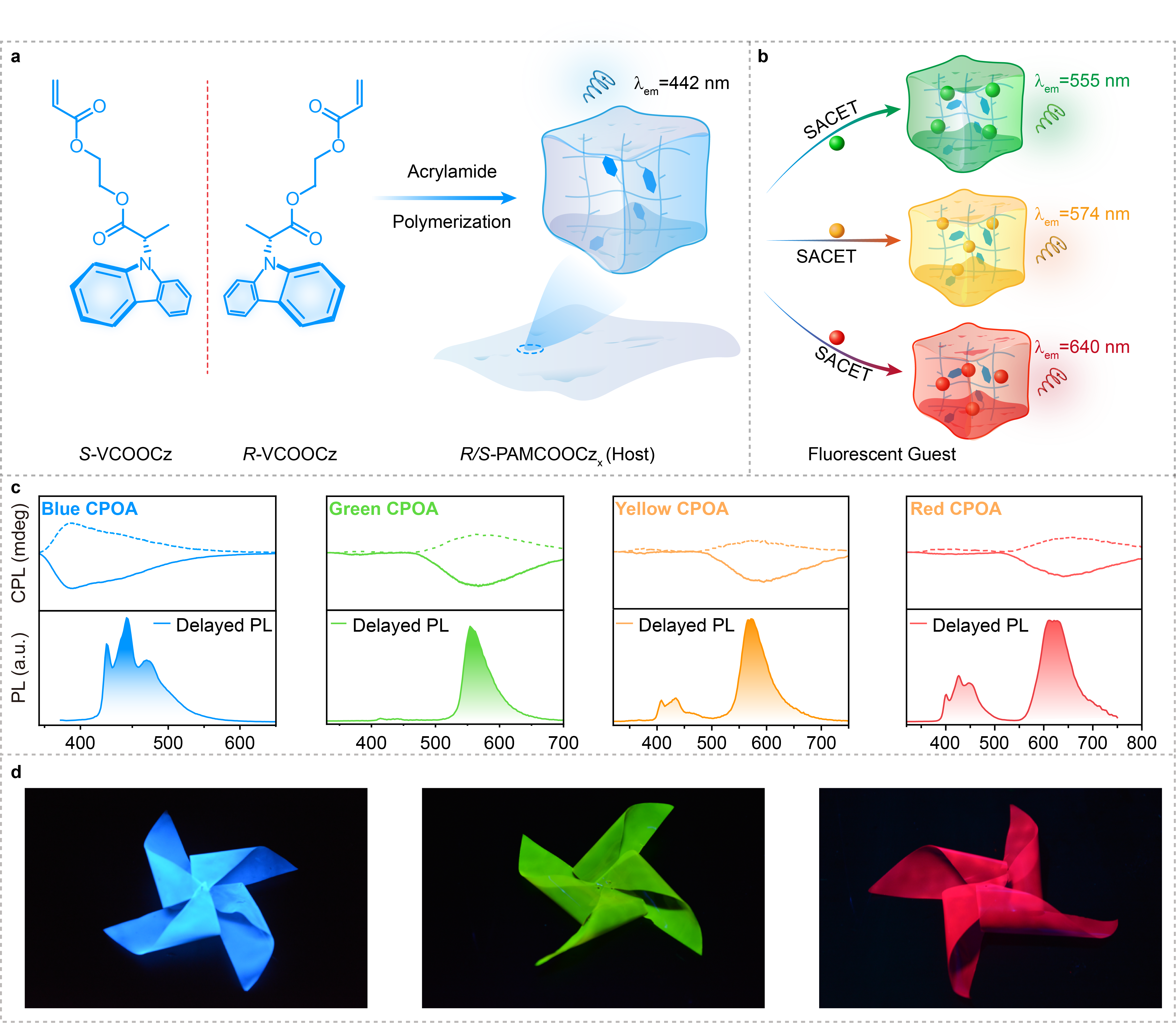 有机电子与信息显示国家重点实验室黄维院士团队陶冶和陈润锋教授在手性有机长余辉领域取得新进展,提出了一种通过共价自限域手性发色团来获得蓝色手性长余辉的简单方法,设计出具有超长寿命、高发光不对称因子的蓝色手性有机长余辉聚合物。将蓝色手性余辉聚合物作为主体与荧光客体共混,利用余辉和手性协同能量传递策略,成功地实现了全彩手性余辉发射体系的构建,并探索了该类材料在信息加密、立体显示等领域的应用。4月9日,相关成果以“Enabling robust blue circularly polarized organic afterglow through self-confining isolated chiral chromophore”为题发表在Nature Communications(《自然•通讯》)上。麻豆视频