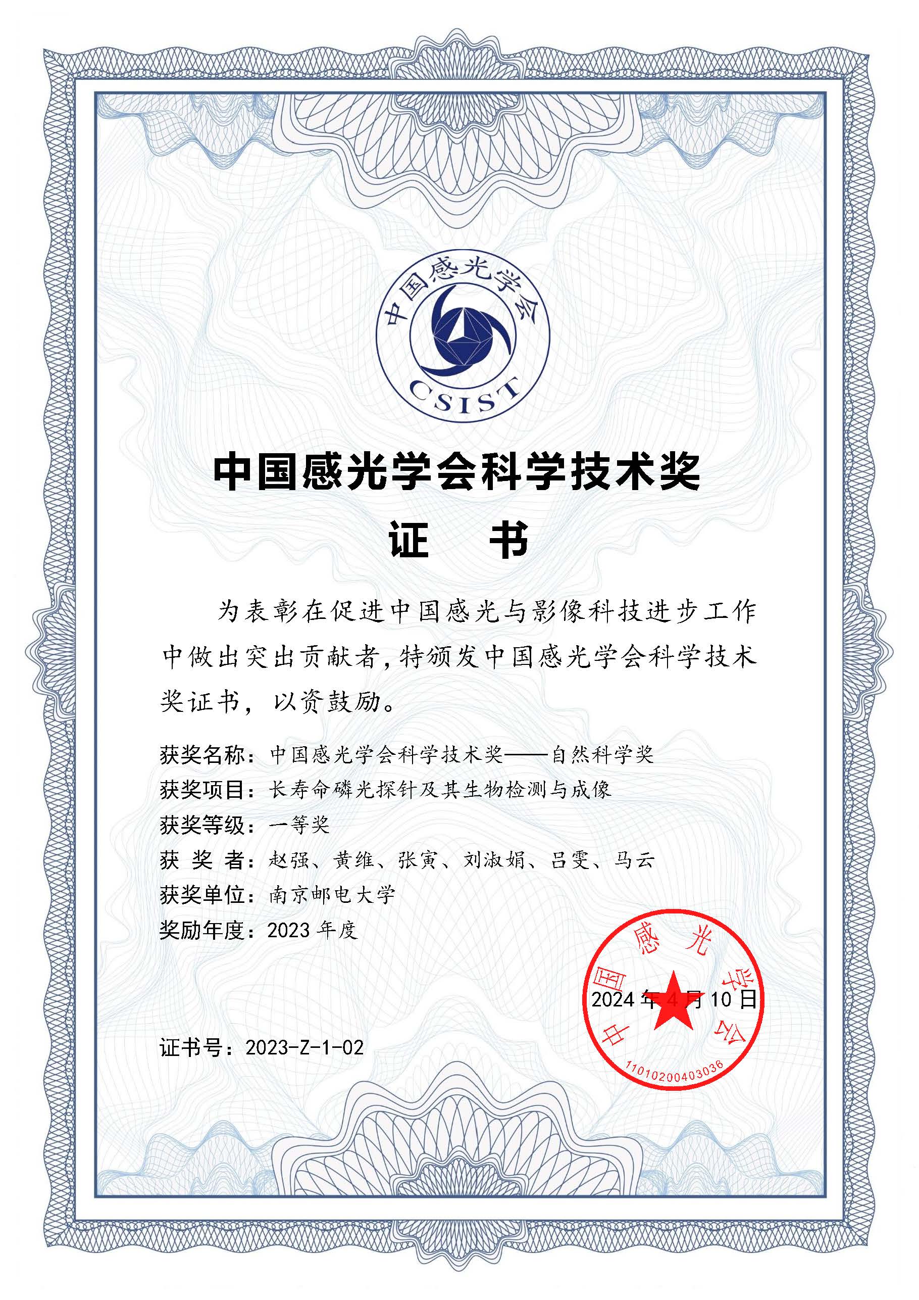 中国感光学会是中国科学技术协会的组成部分,其每两年颁发的“中国感光学会科学技术奖”用于奖励在全国感光与影像科研及创新创业活动中做出突出贡献的团体或个人。该奖项备受业界瞩目,被认为是国内感光与影像领域发展的风向标。中国感光学会科学技术奖包括技术发明奖、自然科学奖、科学技术进步奖和青年科技奖,该项目荣获了2023年度唯一的自然科学奖一等奖。