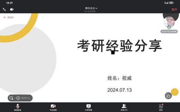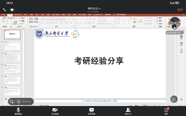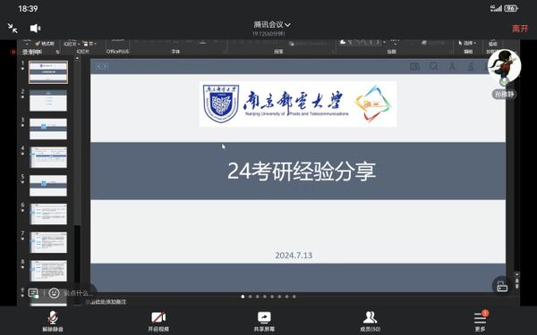 会议中,2020级本科生王子豪同学向大家分享了他就如何合理规划、如何协调考研复习提出了中肯的建议,强调有付出才会有回报;2020级本科生孙雅静同学从考研目的、择校及专业、备考建议三方面讲述了自己考研时的收获,并强调学习始终是需要摆在第一位的,希望大家树立专业理想,拒绝懒惰,多想多做才能终有所得;2020级本科生祝威同学介绍了如何备战考研并鼓励大家既然选择考研就不要轻言放弃,要坚定信心持之以恒,有志者事竟成;2020级本科生温媖茹同学分享自己是如何准备出国留学的,并希望大家能脚踏实地,认真考虑自己的将来,早做打算。