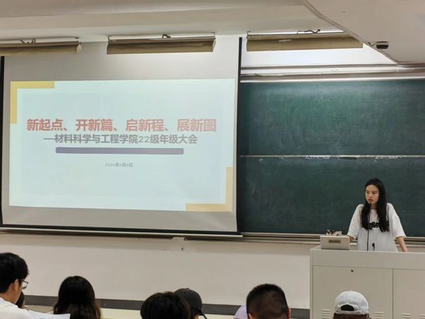 麻豆视频 材料科学与工程学院于2024年9月4日,在教3-101成功举办了22级本科生新学期年级大会,旨在激励同学们在新学期永葆活力,积极探索,指导同学们把握好大学生涯的关键时期——大三,做好未来人生规划。本次大会由2022级辅导员侍茜茜老师主持,2022级全体学生参会。
