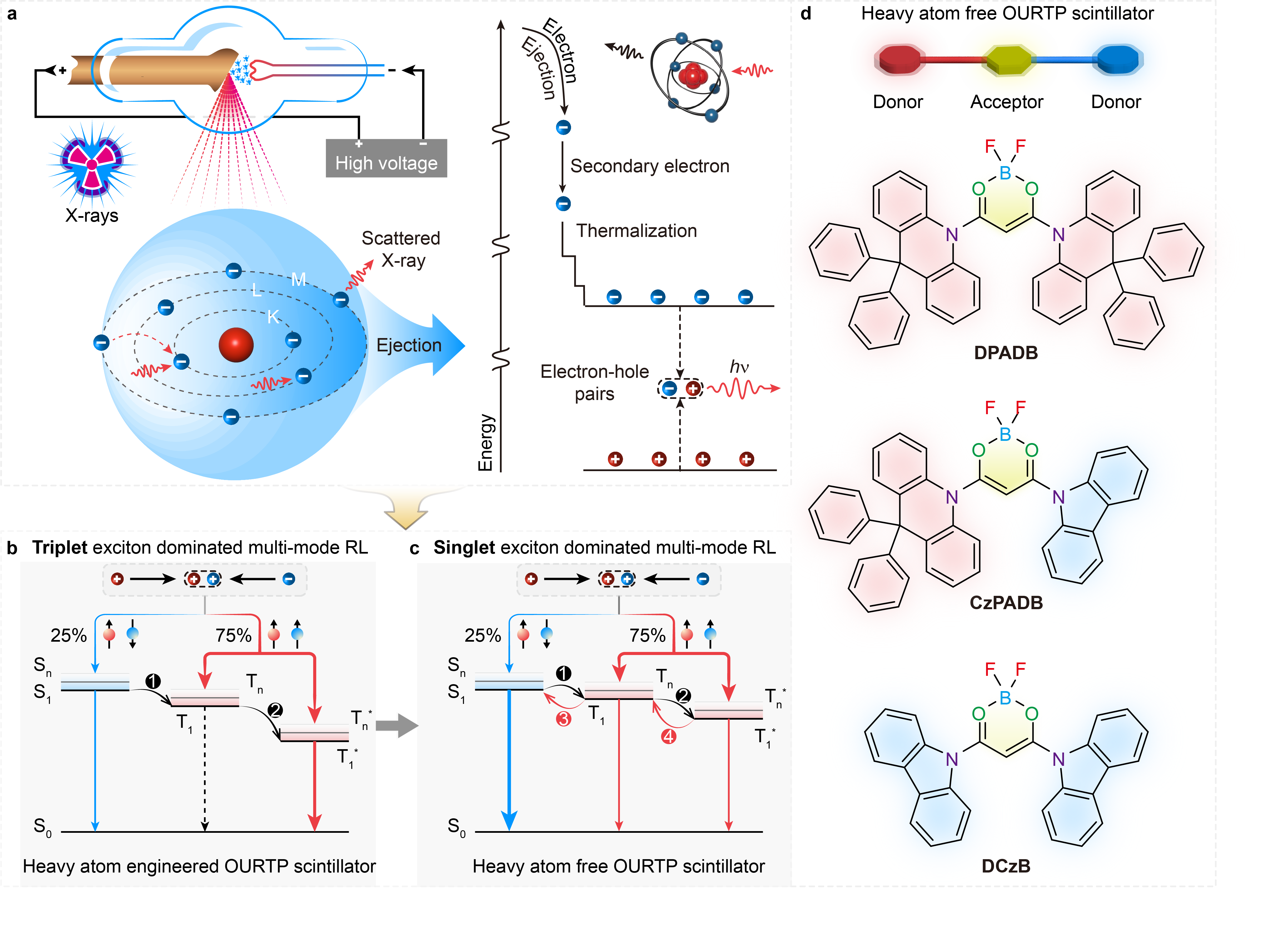 图1:X射线激发下多模辐射发光机理示意图。(a)X射线激发下电子击出和电子空穴对复合示意图;(b)三重态激子主导的多模辐射发光机理;(c)通过热活化激子释放策略构建单重态激子主导的多模辐射发光机理;(d)磷光闪烁体分子结构