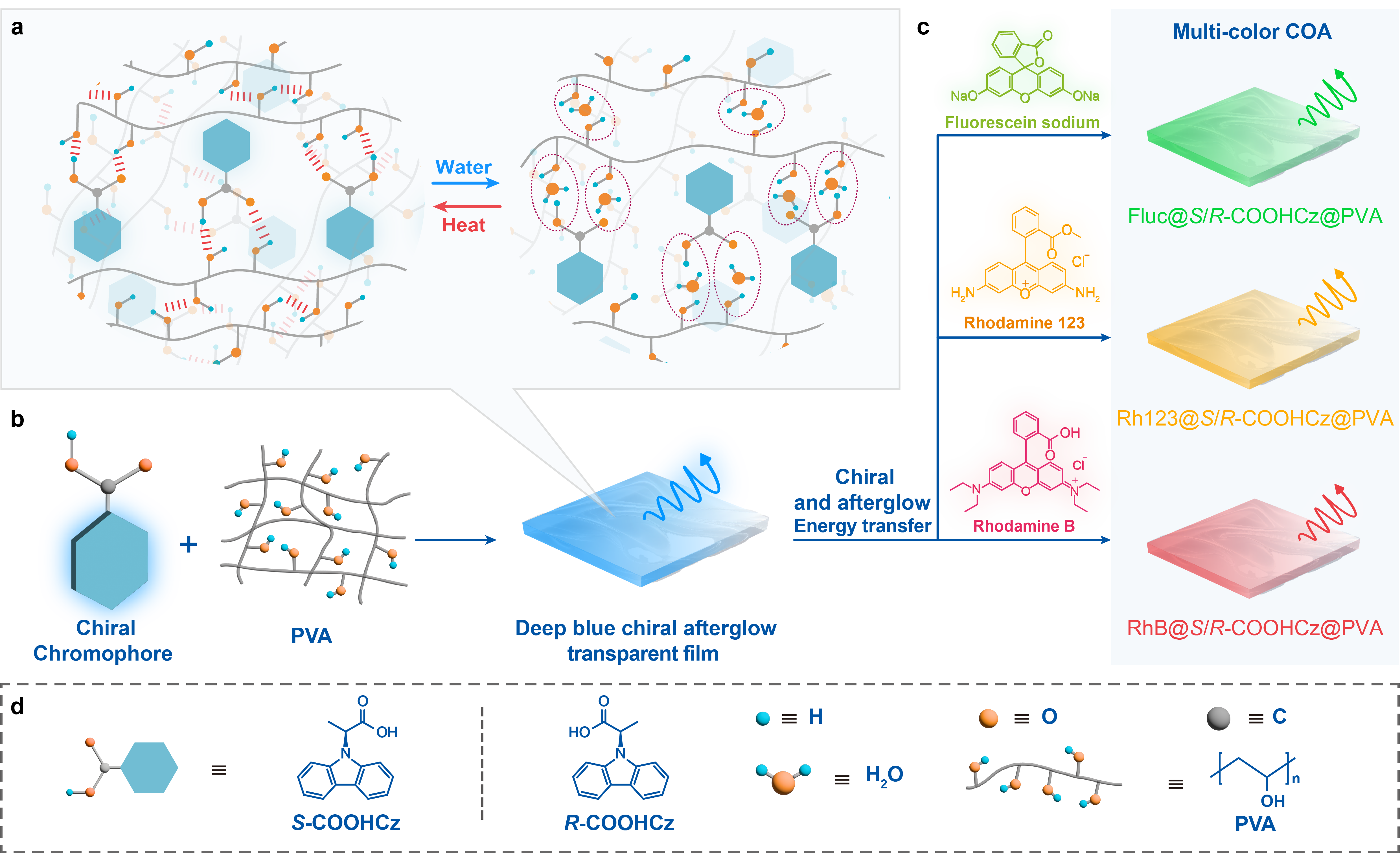 图1:刺激响应性颜色可调的手性余辉设计示意图。