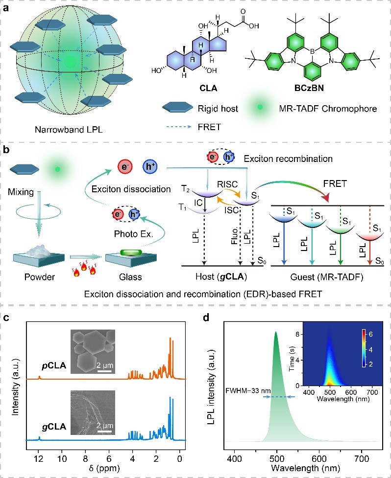 针对这一问题,张景瑜同学报道了一种光照射激子解离再复合(EDR)的胆甾型主体,通过简单而有效的熔融冷却处理,将具有窄谱带发光特性的MR-TADF发色团稳定孤立在主体中,通过从主体到MR-TADF的有效Förster共振能量转移(FRET)可产生高性能窄谱带长余辉,表现出只有33 nm的小FWHM、超过10 s的长持续时间以及从深蓝色到橙色(414-600 nm)宽范围内的颜色调谐。此外,利用材料窄带长余辉和易于加工的特性,设计和制作出厘米级柔性光波导纤维和集成FWHM/颜色/寿命分辨的多级加密/解密装置。这种新颖的EDR和单线态/三线态到单线态FRET策略可实现出色的长余辉性能,为构建具有简便制备方法的柔性有机余辉提供了一种有前景的方法,同时也为有机余辉中窄带发射的设计提供了宝贵的科学见解。