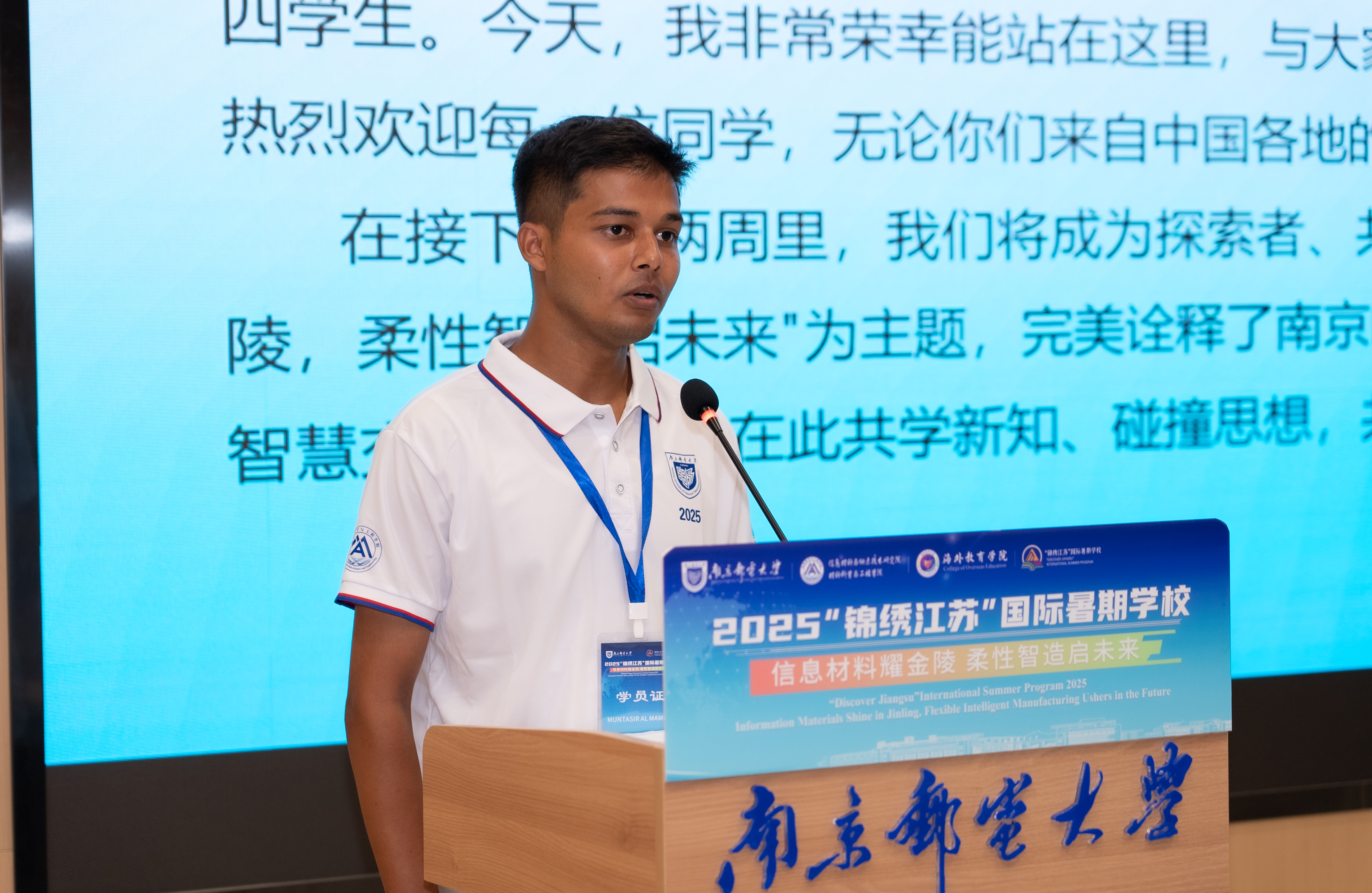 来自孟加拉国的Muntasir Al Mamun作为国际学员代表发言。他表达了对本次学习之旅的期待与感激,希望将计算机人工智能知识与柔性智造创新结合,深入了解南京这座古都的千年风华,结识来自世界各地的朋友,共同创造难忘的跨国友谊。